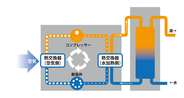 エコキュートは「ヒートポンプ」と「貯湯タンク」の2つで構成されます。「ヒートポンプ」とは、エアコンの室外機と同じ形状をした「熱をつくり出す機械」のこと。「貯湯タンク」は、沸かした湯を貯めておくタンクです。エコキュートは次のようにして湯をわかします。